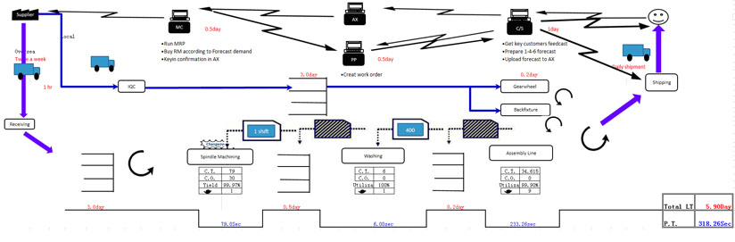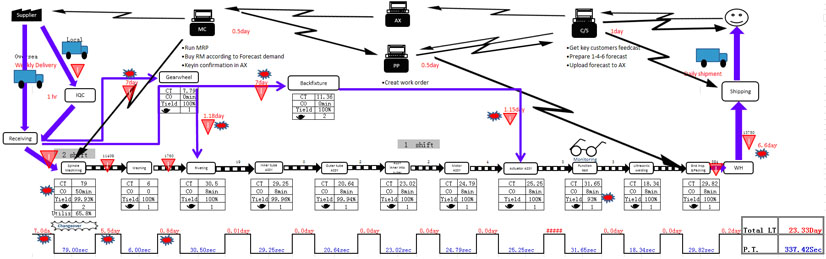 在项目前期阶段,Cantech将通过价值流程图分析客户整个生产过程中的交期时间、当机时间、在制品库存、原材料流动、信息流动等情况,找出过程中不增值的活动和改善点,结合自动化技术手段从整体上提供最优解决方案。价值流程图可以让我们用精益的视野诊断企业,结合自动化技术消除浪费。