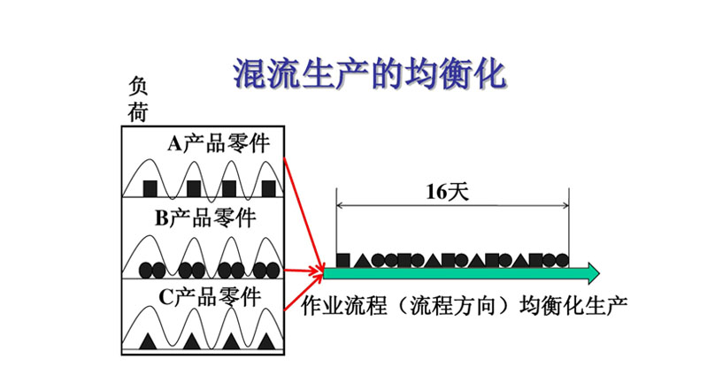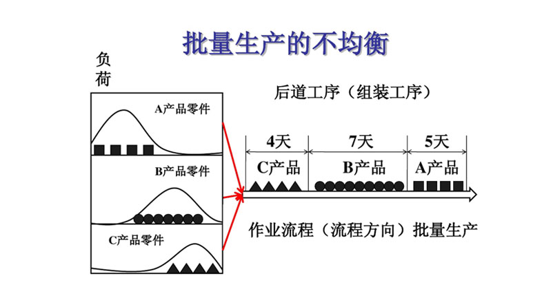 2、即使客户的订单是有波动的,若厂商在生产了4天C产品后才收到客户通知减少本月C产品的供货量,此时厂商的C产品并未过量生产,可对生产量进行实时灵活调整。因此均衡化生产可有效地适应多品种生产,能有效地减少交期,也可有效地减少因为客户需求波动引起的内部混乱。节拍时间规定生产步调以匹配客户需求速率,是整个生产系统的“定调者”。均衡生产通过将周期时间与节拍时间匹配,使生产系统的能力与客户的需求匹配,且在整个流程中找到“定拍工序”。由于均衡生产无形中增加了换线的次数,因此实现快速换模是均衡生产的重要前提。在此基础上,确定pitch time(一般以标准容器的量来计算),再结合均衡柜和看板实现均衡生产。